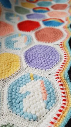 My unicorn Hexi puff blanket is constructed with individual Hexagons of which I have designed two intricate motifs. A Unicorn and a Rainbow.