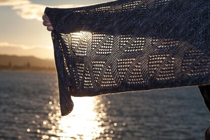 The stitch pattern is intuitive to knit and easy to memorise, with triangular lace ‘tiles’ nesting together to form a pattern of hexagons on the garter stitch background.
