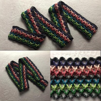 Size: The scarf is approximately 3 ¾ inches wide and 58 inches long. Directions are included for changing the scarf’s length and width.