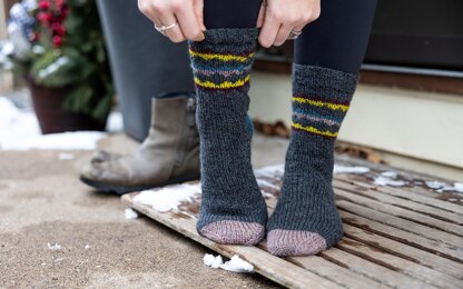 Knit with worsted weight yarn, these cozy wooly socks are great for a cabin weekend, day out in the snow playing or just a lazy day at home with your knitting or a great book.