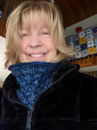 Why “Hidden Lace”? When you knit a lace pattern in bulky yarn, it looks entirely different, with a squishy, stretchy feel that is wonderfully cozy as a cowl. The Twin Rib pattern does not curl, so the cowl stands up on its own to cover the neck area. My mom would have loved this feature (she always joked about getting a face lift and never did). This pattern is in honor of her, Jane Stanley, gone now for many years and still missed.