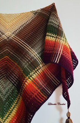 How long you make this wrap is up to you. I used this pattern as a stash buster of autumn colours. A colour scheme is included in this pattern to see the exact colour changes used. You can make this wrap in any type of yarn you like, and just add or exclude rows to make it the right size. The yarns mentioned here are recommendations, but by no means exclusive! I used crochet hook F/4mm with DK weight yarn.