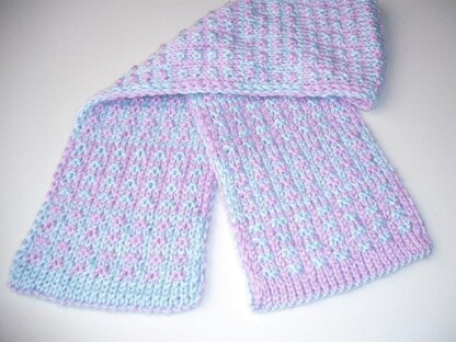 This is a slipped stitches double-knit scarf. It has some texture for fun and is a fast knit for a double-knit scarf. This pattern utilizes one yarn at a time and each row is done in two passes.