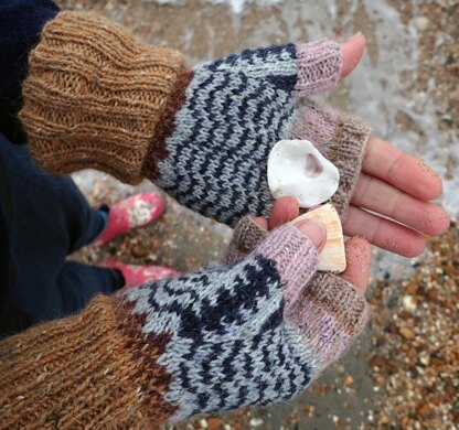 Hand knit a pair of cosy fair isle mitts with this simple yet striking mitten knitting pattern. This fingerless design is ideal for keeping your hands warm on chillier days, while leaving your fingers free to manage your phone, purse, coat buttons and dog leads. Knitted in the round, the cuff is in rib and the simple fairisle pattern repeats are worked from a colour knitting chart. The thumb uses basic directional increases (instructions given) to create the gusset. Knitted to the tension in the pattern, these delightful mitts fit an average sized adult female hand. The pattern is knitted in Rowan Felted Tweed DK but would make a great 4ply stash buster. This cute pattern is an ideal project for those wishing to practice their two colour stranded colour work technique in the round, as well as providing a relaxing knit for more advanced knitters. It is part of a mini accessories collection inspired by the colours and treasures found at Hill Head, my favourite coastal dog walk.