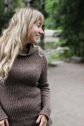A simple and comfy turtle neck sweater in twisted ribbing. The sweater features overly long raglan sleeves and interesting placement of increases and decreases in the body to give the garment that special something.