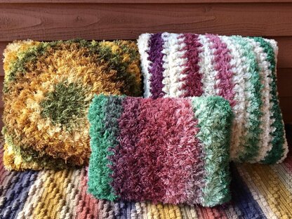 Fur & Shag pillow. 20-inch (51 cm) square pillow form. You will need 2 balls or about 76 yards (70 m) of Lion Brand That ‘70s Yarn and 2 balls or about 128 yards (120 m) of Lion Brand Go For Faux super bulky 100% polyester yarn.