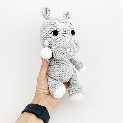 The hippo measures approximately 18 cm in a seated position when using the materials mentioned above. If you are using yarn with a different gauge the toy’s measurements will change.
