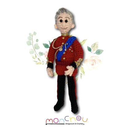 This tribute to King Charles III is made with worsted weight yarns with wired limbs. This pattern is 12 pages long and includes more than 30 colour photos to help you along the way.