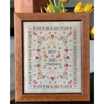 A beautiful Wedding Sampler featuring Love Birds, bees and butterflies all encircled in a gorgeous border of hearts. The outside border features the words Mr & Mrs and other romantic sayings. The design has been stitched in a palette of greens, blues and pinks. This will make a lovely gift for a Wedding or Anniversary. There is space in the middle to personalise the design.