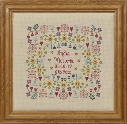 This gorgeous Flower Birth Sampler kit contains 16 count Aida fabric, pre-sorted threads, gold plated needle, printed chart and full instructions.