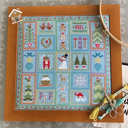 A beautiful Christmas design stitched on blue fabric. The design has boxes which depict a Christmas motif. This makes a lovely design which you can hang on your wall for many Christmases to come.