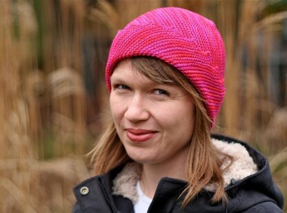 Ever wondered what a hat would look like that matches your Hitchhiker scarf? Like a Hitchhat, of course! Biased garter stitch brings out the best of a handdyed, variegated see-me- color. And the trademark Hitchhiker border adds just a little interest. It can be worn the slouchy way or with the brim folded up, according to your personal style. It knits up real quick and is a great use for leftovers!