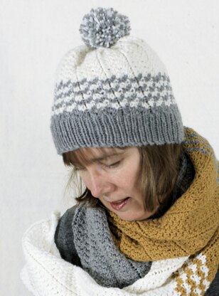 Worked from the brim to the crown, this hat features a textured pattern using 2 colors of worsted weight yarn. Stripes are used to transition from one color to another. Though the patterning looks like stranded work, only one color of yarn is used at a time.