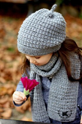 A simple slouchy hat with a folded brim and fun I-cord loop on the top. Hat is knit bottom up in the round in no time and can be a perfect last-minute gift for someone special! It is complemented with a wide end-to-end scarf in reversible textured stitch.