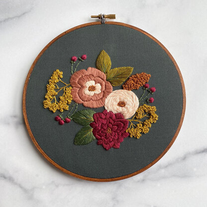 Beginner embroidery kit containing everything needed to learn how to embroider.Digitally printed cotton fabric, an unfinished wooden embroidery hoop, DMC embroidery needle size 5, instruction booklet, and full skeins of DMC embroidery floss.