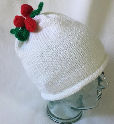 Just when you feel you need a bit of something "special" to wear around the Holidays, try this cute hat. Easy to knit pattern, with cute red berries and green leaves on top to adorn hat! All ages will love to wear this, as it can celebrate the Holidays without being too flashy. A very fun and easy pattern to knit, that you will be able to make a lot of these for Holiday gift giving. This pattern uses worsted weight yarn, a size 4 yarn, and knitting needles, 16 inch circular size 7. A few double pointeds size 7 are used only at very top of hat, for only the last few rows, which makes this whole hat very easy.