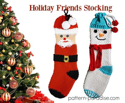 And the stockings were hung by the chimney with care..... Make these adorable holiday friends stockings for a fun holiday touch. The top of the stocking closes with a crocheted drawstring to form a hat on either the snowman or Santa Claus. These are perfect as gift containers too!
