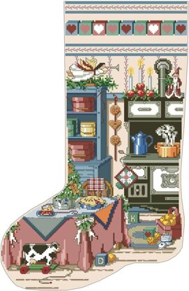 Designed by: Sandy Orton. Can you smell the holiday treats? Bring a little heartwarming charm into your home with this vintage kitchen design boasting with flavor! This stocking shows a Victorian style kitchen with wood-burning cookstove and table covered in baked goods.\n