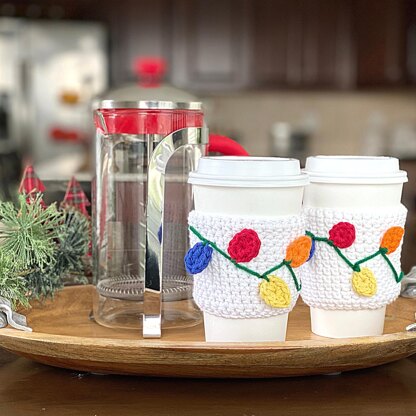 Everyone loves an excess of lights during the holidays so why not add some to your coffee cup! Crochet this festive holiday lights cozy for yourself and as a cute gift for friends and family. I've made gifting your finished cozy super special as this pattern includes a matching cup cozy printable template. Simply print, cut and place your cozy so it sits on the tabs on the side of the cutout to achieve a colorful professional look.