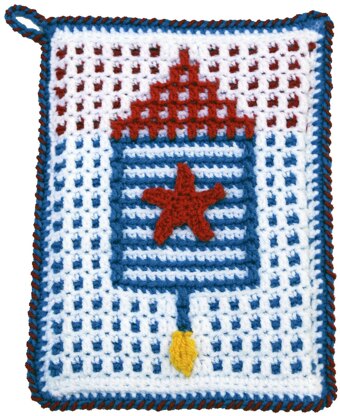 Holiday Potholders, #120 Rudolph Reindeer, Angel, Tree, Jack-O-Lantern, Bat, July 4th Rocket, Easter Egg. All color changes are made at beginning of rows so you are only working with one color at a time. Mosaic crochet designs are formed by cleverly placed dropped dc sts worked in front lp of st 2 rows below. The 7 double thickness potholders are made using worsted weight yarn in your choice of cotton or acrylic. Includes written instructions as well as optional graphs. Easy to intermediate skill.