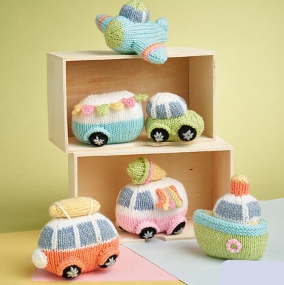 In the sweetest pastel shades, here is a soft play transport set for little ones that will keep them occupied on summer holidays. The set includes a car, caravan, camper van, plane, boat and ice cream van. Designed by Amanda Berry @fluffandfuzz, the vehicles are knitted in acrylic DK yarns on single pointed needles (not in the round). The ice cream van pattern incorporates intarsia colour-work, and the other vehicles use duplicate stitch embroidery (Swiss darning) for the finishing touches. For confident beginners and above, other techniques used include casting on and off, knits, purls, increases and decreases, knitting stripes, and seaming to finish.