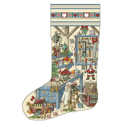 Holiday workshop extravaganza. Step into the crafter's workshop and those that work with tools to create unique gifts. Stitch this tribute to all who imagine, create and use their skills to produce a unique gift. A beautiful, big and detailed stocking by designer Sandy Orton.