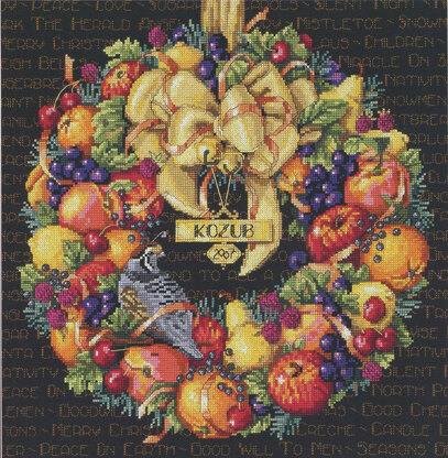 By Nancy Rossi. A fruitful wreath bursting with delicious color and flavor of wholesome foods to enrich our lives. A decorative gold bow, stitched bells and a partridge enhance the festive season.