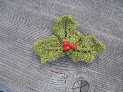 I design a “Noel” decoration for the door a very long time ago and the decoration included some Holly and Berries. It just ran through my head the other day that those Holly and Berries would make a cute pin. A very, very quick knit.