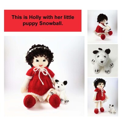 Meet Holly a lovely knitted doll and her little puppy Snowball which would make a perfect gift at any time but especially a Christmas gift for someone special. She stands around 33cm (13 inches) tall and comes complete with her cape, pinafore dress, earmuffs and little puppy dog. Her cape, pinafore dress and earmuffs are all removable. The patterns are knit flat and seamed and are very easy to follow with clear instructions and photos.