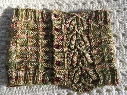 A richly textured neckwarmer in three sizes (S/M/L) that features an openwork panel in leaf motif with button closure along one side. Choose a soft but springy yarn for a cowl that supports itself nicely while allowing the welted fabric to slump into a slight slouch to one side.