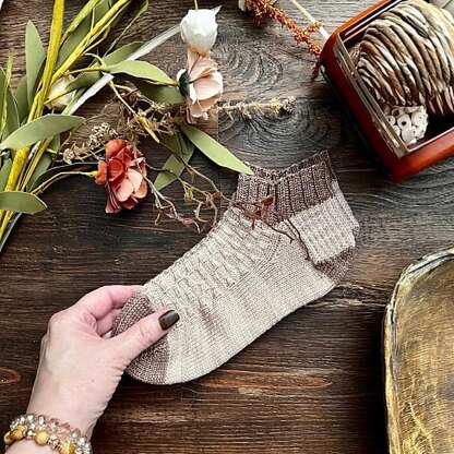Home for the Harvest represents the fall giving season. With its subtle texture of “hay-like” stacks, warm tones, and elegant appearance, this sock will be your new favorite. I enjoyed the slipped & knit stitches of this easy to memorize stitch pattern. No purling, no cables, or no charts to worry about with this stitch pattern.