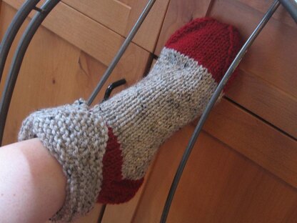 Slippers knit flat with short-rowing in garter for top flap, then joined in round for leg, heel and instep/gusset, on dpn’s or ‘Magic Loop’. You could also use two circulars. Standard pigeon slip-stitch heel, decreased back to gusset and standard Kitchener grafted toe. Sized comfy fit to be worn over socks.
