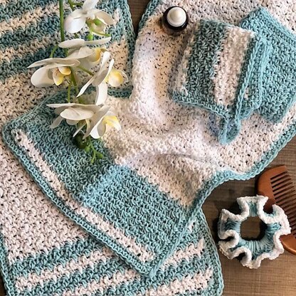 Fresh, charming, utterly pampering…this pattern set of two washcloths, two hand towels, and a convenient little hair-scrunchie, brings holistic spa vibes to your own home bath! Worked in Lion Brand Yarn’s Coboo, the cotton-bamboo blend is naturally absorbent, and silky soft on the skin. A little handcrafted luxury for you or someone you love. Let’s get started and together crochet something beautiful!