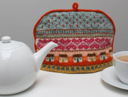 First published in March 2012 on Hand Knitted Things Blogspot this colourful Fair Isle inspired tea cosy features little houses and panels of hearts. It’s worked with 11 colours of Jamieson’s of Shetland DK weight yarn.