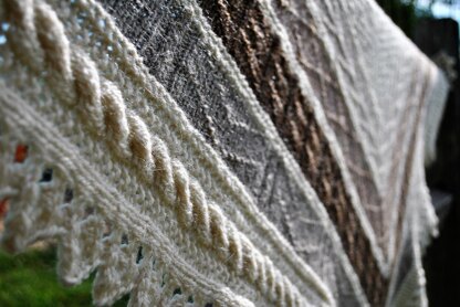 I have always loved gansey sweaters and I wanted to create a large shawl that shared some of the same textures/design features. Though it is a larger project, the individual sections go rather quickly.