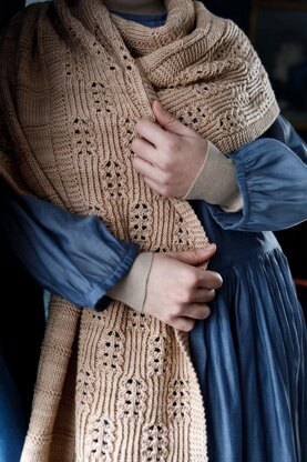 Homestead is a big and snuggly rectangular scarf, featuring delicate garter frames, beautiful lace elements, twisted rib columns as well as classic stockinette. The scarf is knitted from one short edge to the other.