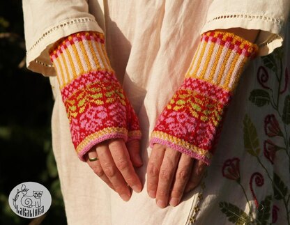 Design details: ● stranded colorwork mitts with ribbed cuff ● knitted in five colors ● worked in the round on DPNs ● with thumb gusset ● right and left mitt's pattern