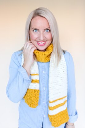 The Honey Mustard Scarf is a beautiful bold stripe design bringing interest with a cobble style texture. Suitable for advanced beginners.