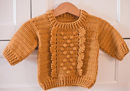 Honey Sweater will be perfect for both – boys and girls, just omit the ruffle for boys. It’s worked bottom up, with no seams, then divided for back and front. Only seams to make are the shoulder seams.