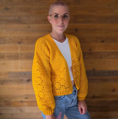 I'm absolutely buzzing to introduce you to the Honey to the Bee cardigan. Made from DK yarn and a 4mm hook, this super simple filet pattern uses basic stitches and chain spaces to create a bee-utiful honeycomb pattern across a lightweight cardigan. Graded for sizes XS-5X with five length options from 46cm to 63cm, you're sure to find the perfect fit for you. The perfect introduction to filet crochet, this is a beginner friendly make with easy shaping for the front panels and two different sleeve options. Size / finished circumference / approx. meterage (shortest-longest length). XS / 89 cm / 930-1135 m S / 99 cm / 1010-1235 m M / 110 cm / 1090-1340 m L / 117 cm / 1175-1440 m XL / 131 cm / 1295-1595 m 2X / 136 cm / 1355-1670 m 3X / 149 cm / 1440-1785 m 4X / 160 cm / 1535-1895 m 5X / 173 cm / 1670-2070 m