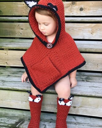 PDF crochet pattern for Hooded Fox Poncho with matching Fox socks. Fun whimsical poncho design features Fox hood with large wooden button and pocket. Worked in a woven stitch using single crochet stitches. Quick sock design is worked in double crochet stitches with fox features. Full video tutorial for Poncho included with pattern purchase. Use coupon code included in pattern at https://www.mjsoffthehookdesigns.com/course/hooded-fox-poncho-course/