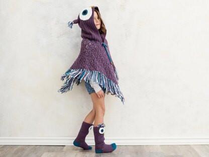 PDF crochet pattern for Hooded Owl Poncho with matching Owl socks. Fun whimsical poncho design features Owl hood with fringe and beaded drawstring. Worked in a beautiful shells and V stitch pattern. Quick sock design is worked in double crochet stitches with owl hood features.