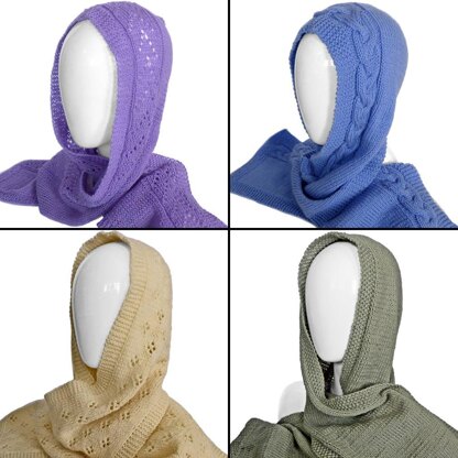 Soft and feminine, this cozy hooded scarf is easy enough for even a beginner to knit. It's beautiful in a variety of light and medium weight yarns, and almost any fiber. I've used acrylics, wools, blends and fuzzy yarns like angora and mohair with lovely results. Fine yarns produce a fluid airy fabric, heavier yarns provide warmth. Your gauge should be about 20-22 stitches to 4"/10cm.