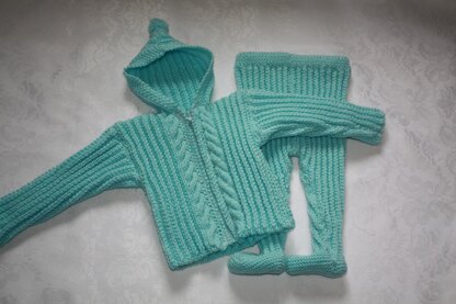 Soft and Cosy Hoodie and Leggings is an easy knit that is worked in Broken Rib Stitch. Because of the stitch used the set is suitable for a very small to a very chubby baby and fits with ease. The hoodie is adorned with a row of cable stitch on each side of the center front zipper. It is easy to make and so soft and cosy to wear. The leggings are worked from the foot upward and also are done in the broken rib knit stitch which makes for ease in wearing. They also fit snug to the leg because of the stitch choice. Done here in Stylecraft DK but any DK yarn will work nicely for this outfit. Just in time for the cool fall days, this set is sure to be a favourite for your special babe. Quick to knit and easy to follow instructions.