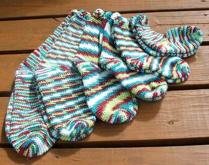 Supplies: Size C Aluminum Crochet hook, Bernat Satin Sport (as shown-Southwest Ombre #4201, #3 Light) Adult Size-Large-10"-10.5" heel to toe and around ball of foot (7 ounces yarn) Adult Size-Medium-9"-10" heel to toe and around ball of foot-(6.5 ounces yarn) Adult Size-Small-8"-9" heel to toe and around ball of foot. (6 ounces yarn) Youth Size-Large-7"-8" heel to toe and around ball of foot. (5 ounces yarn) Youth Size-Medium-6"-7" heel to toe and around ball of foot. (4.5 ounces yarn) Youth Size Small-5"-6" heel to toe and around ball of foot. (4 ounces yarn) Note-Easy to customize for a perfect fit. Find the correct width for you, then crochet in the length for your size. For a tighter cuff, switch to a smaller hook.