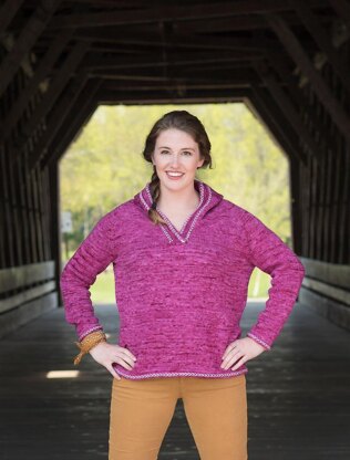 This streamlined hoodie is going to take you everywhere, from the local high school football game or bonfire at the lake, to a fall fiber festival or casual evening out with friends. Contrasting Latvian braids on the hem, sleeves and collar are stunning accents to this hooded sweater. Knit it in your favorite team colors or choose colors that are more subdued to fit your personal color palette. This is definitely your go-to knit for the next hootenanny.
