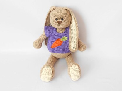 • 300 gr (600 m/ 654 yd) of sport weight yarn (100% cotton) in BEIGE • 100 gr (200 m/ 218 yd) of sport weight yarn (100% cotton) in PURPLE • 50 gr (100 m/ 109 yd) of sport weight yarn (100% cotton) in CREAM • 5 gr (10 m/ 11 yd) of sport weight yarn (100% cotton) in ORANGE and GREEN • Leftover sport weight yarn (100% cotton) in BROWN • 3 mm crochet hook • Two 12 mm security eyes • Stuffing • 10 mm snaps • Sewing thread • Yarn bobbins • Stitch marker