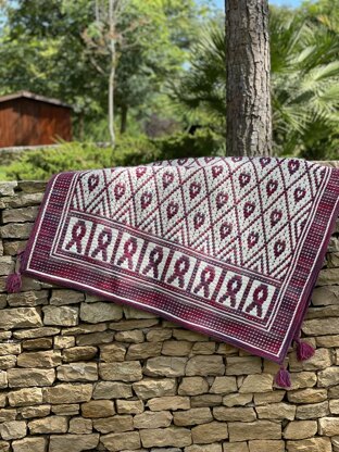 It is written in English (US Terms) and has pictures to guide you through every row and round. It has charts for all blanket parts as well as a chart for the border. However, there is a print friendly version without pictures if you don’t need to follow them.
