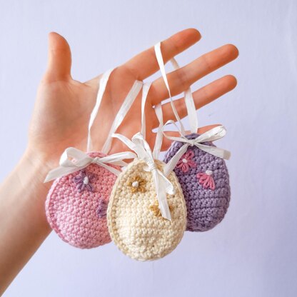 You’ll make 2 halves of the Easter egg, decorate one half and then continue around the outside to seam both halves together. Your eggs will then be finished with a length of ribbon, tied at the front in a bow.