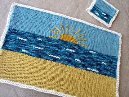 Horizon Placemat and Coaster, part of a group of home knits inspired by the seaside. The placemat measures 38 cm wide x 32 cm deep, and is done in stocking stitch with intarsia sun, and embroidery around the sun. The edging is garter stitch. This is a simple project to make and a good introduction to intarsia.